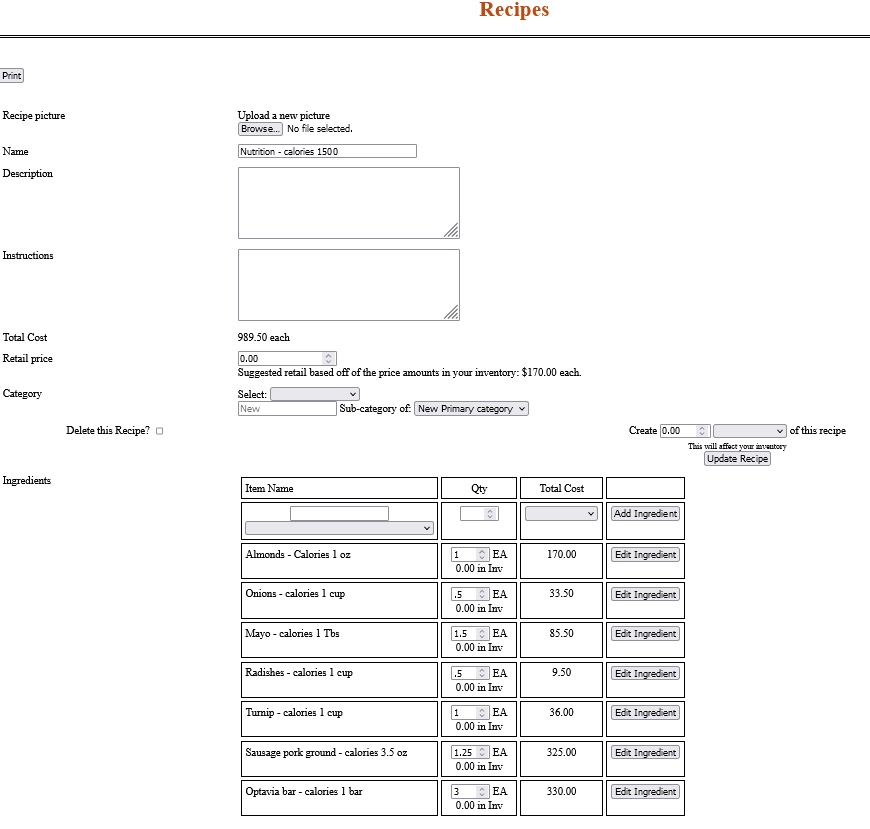 In the Ingredients section, list what you eat in one day under Item Name. In the white box start typing the name of the food. The gray box beneath will populate with Inventory items beginning with what you have typed. I usually just type the first letter and find it in the gray box. If you had entered the serving size in the name of the food then you can put in how much you had eaten. Onions, in the example, shows how many calories is in one cup. I only ate half a cup so in the Qty box I put .5, half a serving. Clicking on Add Ingredient will show you how much calories were in that serving and add it to the Total Cost figure above. Enter what you eat during the day. Click Update Recipe to save it and reopen it after lunch etc. At the end of the day you can see what you have consumed and if you can have desert after dinner and still be okay. Next day just go to the Recipe, backspace or delete each quantity in Qty column to take out the previous day's entries and start anew. |